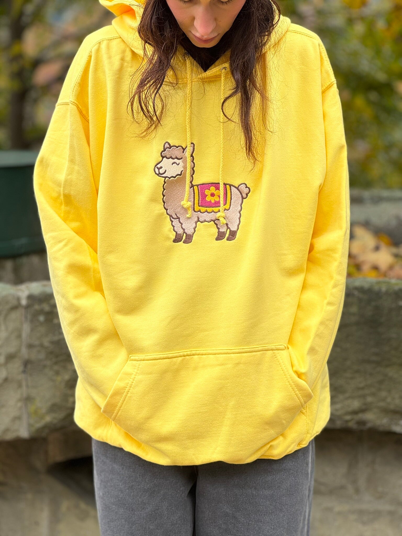 Żółta buza z haftem alpaki na klatce piersiowej. 🦙